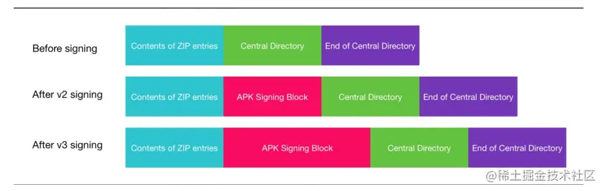 - v2 版本签名块(APK Signing Block)本身又主要分成三部分: