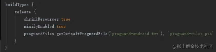 - minifyEnabled 为 true 表示通过 ProGuard 启用代码压缩,配合 proguardFiles 的配置对代码进行混淆并移除未使用的代码。