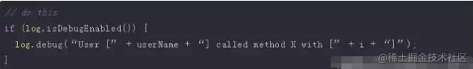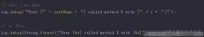 这个建议应该是显而易见的,但不幸的是,很多程序员在写代码的时候都会大多会忽略它。在你创建调试消息之前,始终应该首先检查当前日志级别。否则,你可能会创建一个之后会被忽略的日志消息字符串。