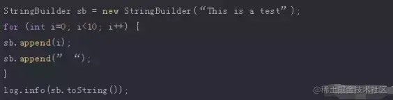 下面的代码片段显示了一个简单的例子。在每次迭代期间,这个循环将i转换为一个String,并将它与一个空格一起添加到StringBuilder sb中。所以,最后,这段代码将在日志文件中写入“This is a test0 1 2 3 4 5 6 7 8 9”。