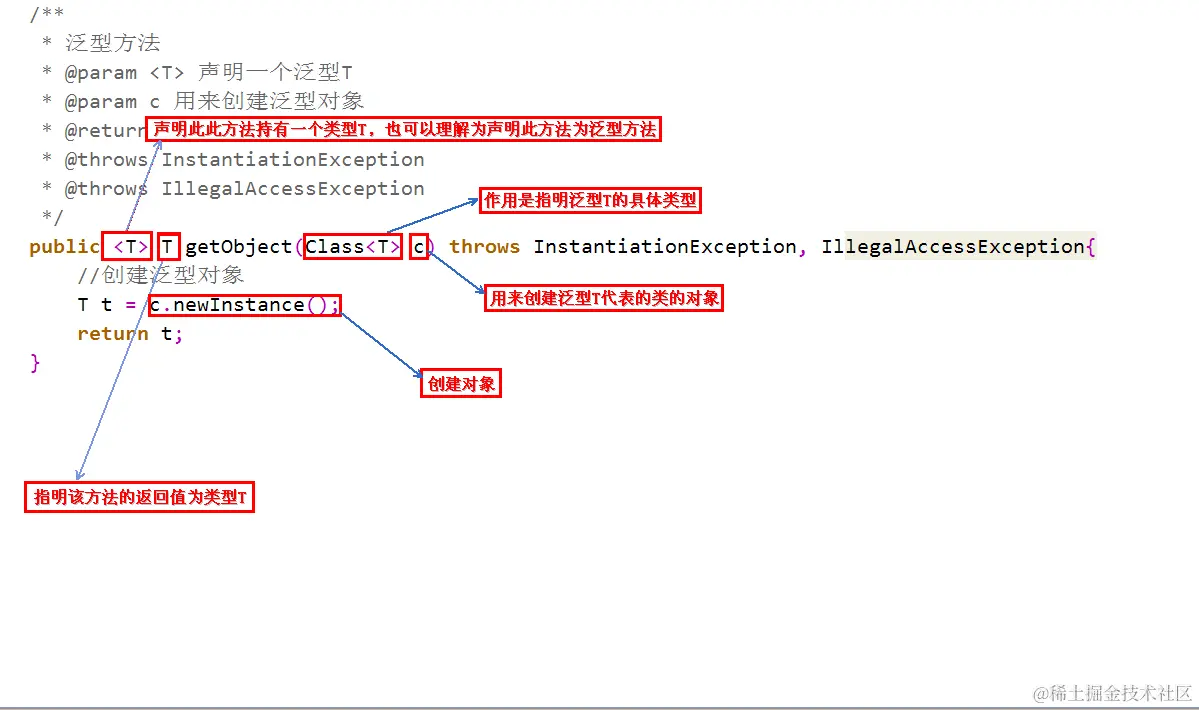 为什么要用变量c来创建对象呢?既然是泛型方法,就代表着我们不知道具体的类型是什么,也不知道构造方法如何,因此没有办法去new一个对象,但可以利用变量c的newInstance方法去创建对象,也就是利用反射创建对象。