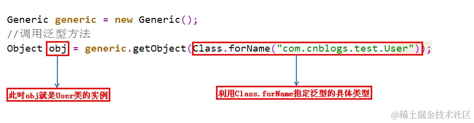 泛型方法要求的参数是Class类型,而Class.forName()方法的返回值也是Class,因此可以用Class.forName()作为参数。其中,forName()方法中的参数是何种类型,返回的Class就是何种类型。在本例中,forName()方法中传入的是User类的完整路径,因此返回的是Class类型的对象,因此调用泛型方法时,变量c的类型就是Class,因此泛型方法中的泛型T就被指明为User,因此变量obj的类型为User。