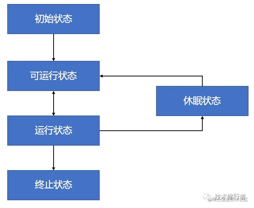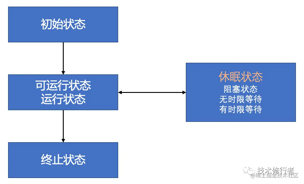 在操作系统层面,线程是会切换到休眠状态的,但是在JVM层面,Java线程的状态不会切换,也就说Java线程依然是运行状态。JVM不关心操作系统调度相关的状态。在JVM看来,等待CPU使用权和等待I/O没有区别,都是在等待某个资源,所以都属于可运行/运行状态。