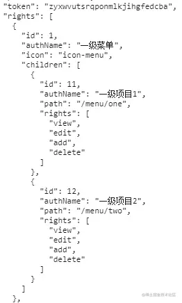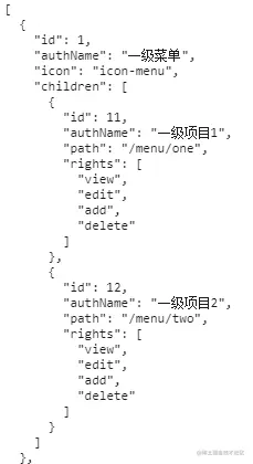 在配置动态路由时,可以将服务端返回数据的关于按钮的操作权限放到动态路由中,首先,让我们看一下数据:
