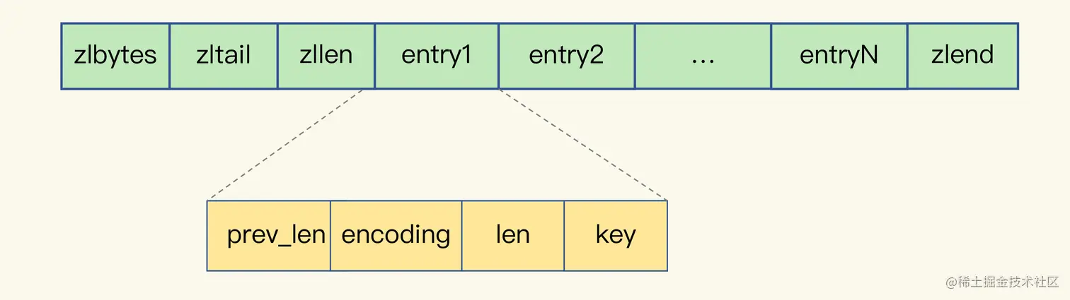 Redis还有一种底层数据结构ziplist,非常节省内存。表头有zlbytes、zltail、zllen 列长度、列表尾偏移量、列表的entry个数。表尾有zlend表示列表结束