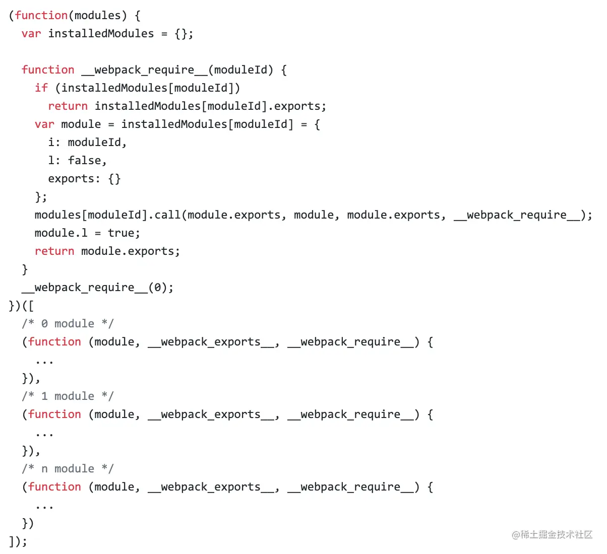 打包出来的是一个IIFE ,modules 是一个数组,每⼀项是一个模块初始化函数。__webpack_require ⽤用来加载模块,返回module.exports。通过WEBPACK_REQUIRE_METHOD(0) 启动程序。