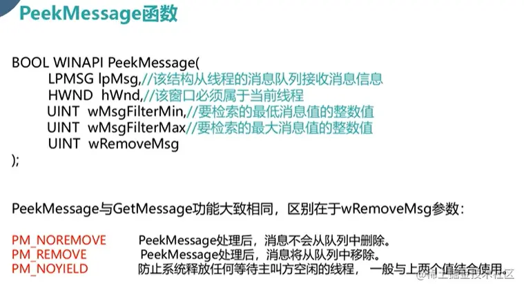 PeeKMessage是非阻塞函数;当系统无消息时,返回FALSE,继续执行后续的代码。