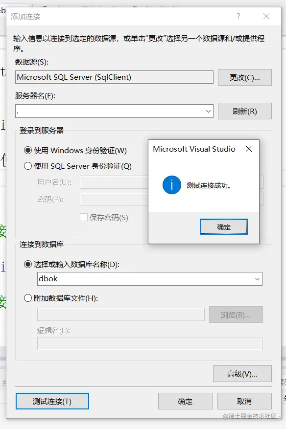 获得连接字符串 ifubing 2021-01-16 118 阅读1分钟 使用vs新建数据连接 新建连接 填入相关的数据 连接成功 获取连接字符串 在右下角 选中并复制 连接字符串的样式 Data Source=.;Initial Catalog=dbok;Integrated Security=True