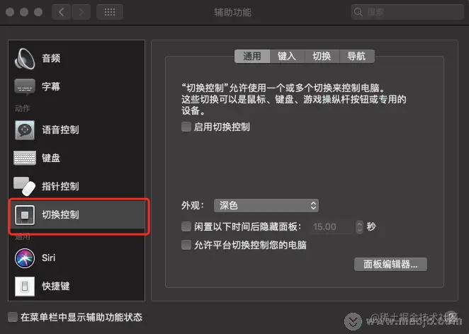 2.点按“通用”,然后选择“启用切换控制”。“切换控制”主面板将出现在桌面上。