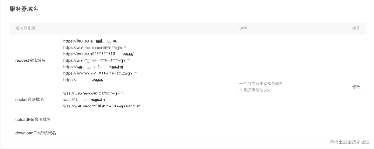 微信后台配置地址:微信公众平台 -> 设置 -> 开发设置 -> 服务器域名。