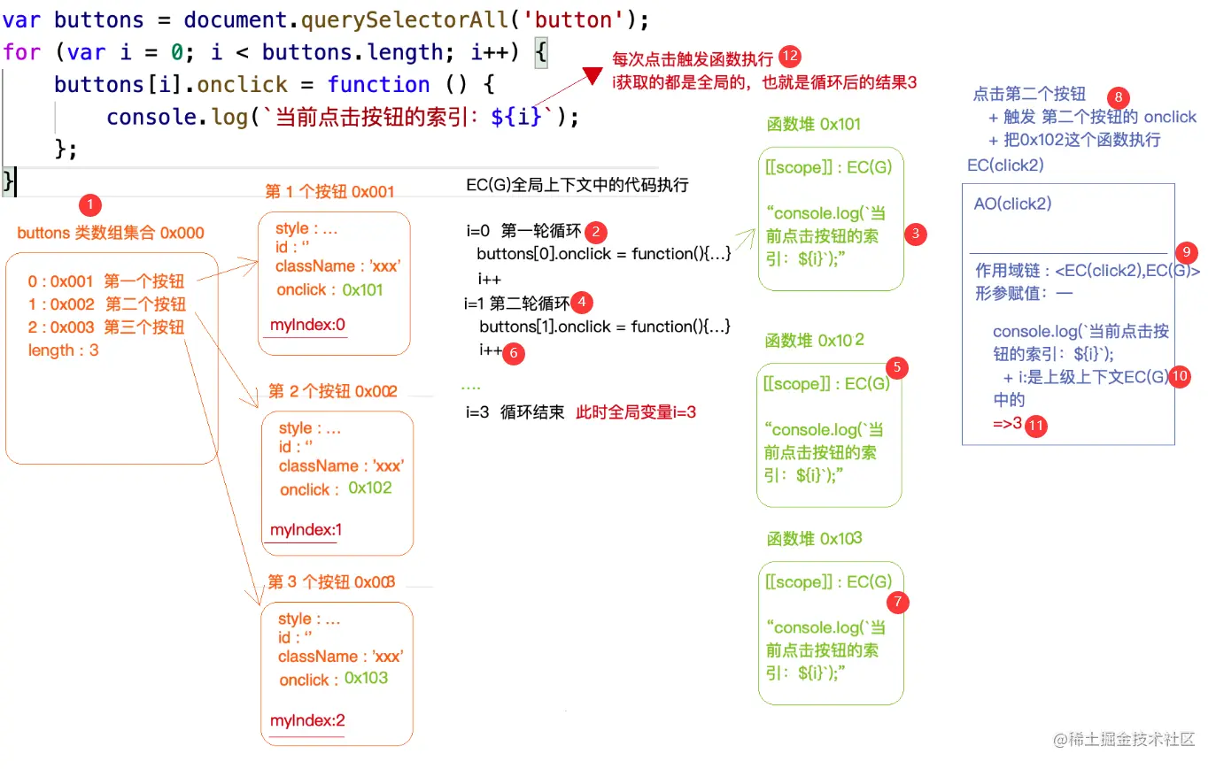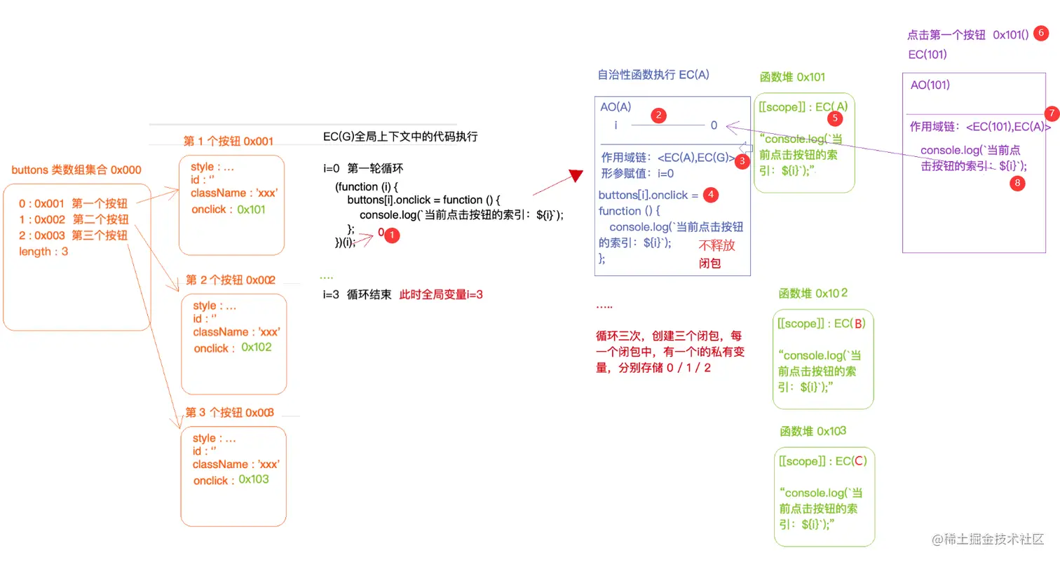 // + EC(A)上下文中创建一个小函数,并且让全局buttons中的某一项占用创建的函数
