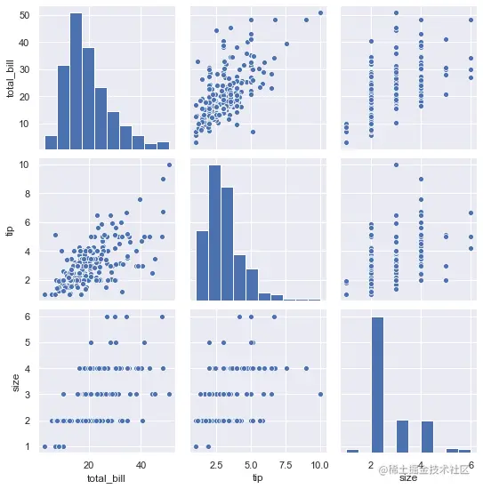 使用**pairplot()**函数实现,该函数会创建一个坐标轴矩阵,并显示DataFrame对象中每对变量的关系