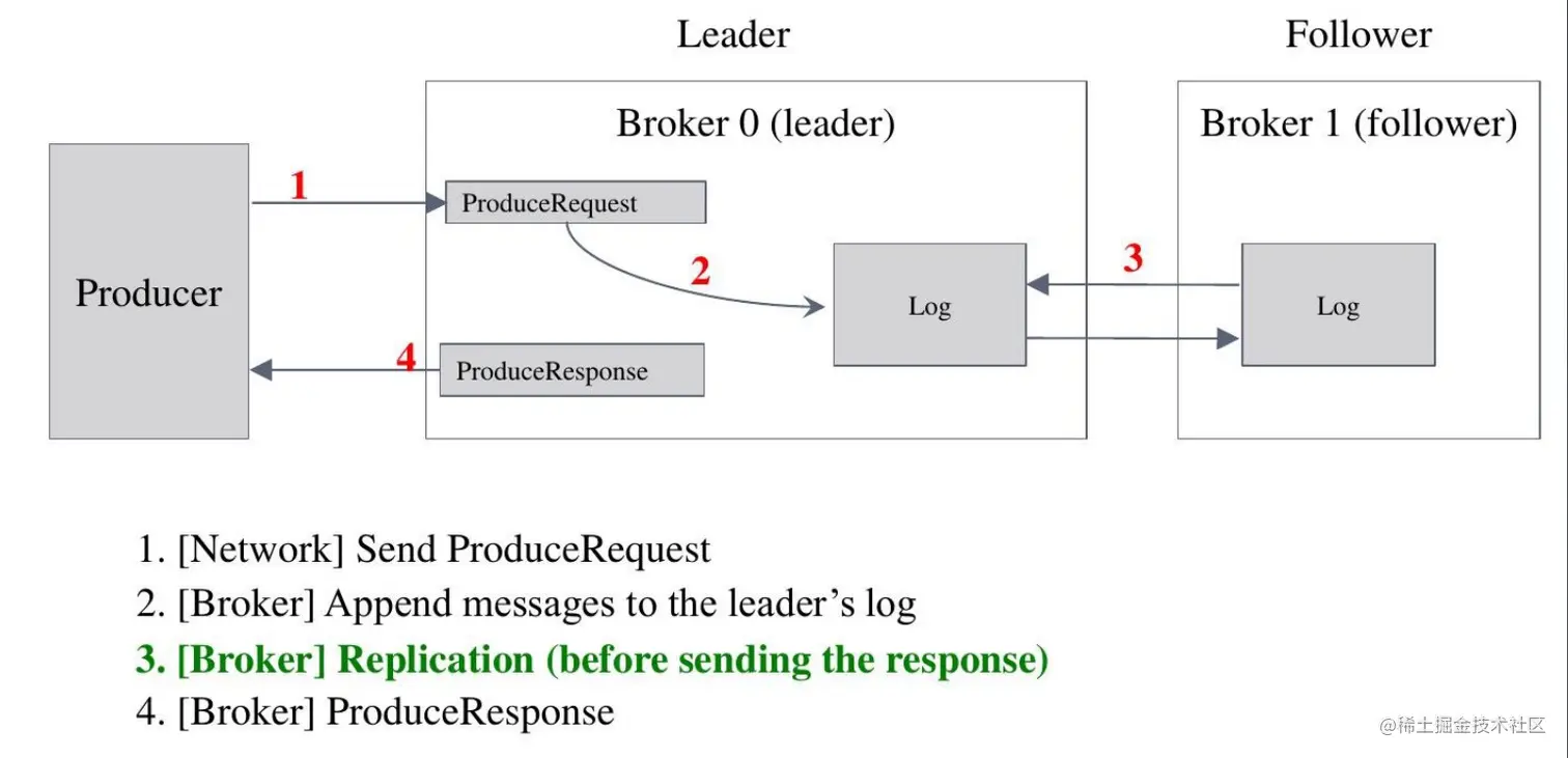 - 当ISR中所有Replica都向Leader发送ACK时,leader才commit