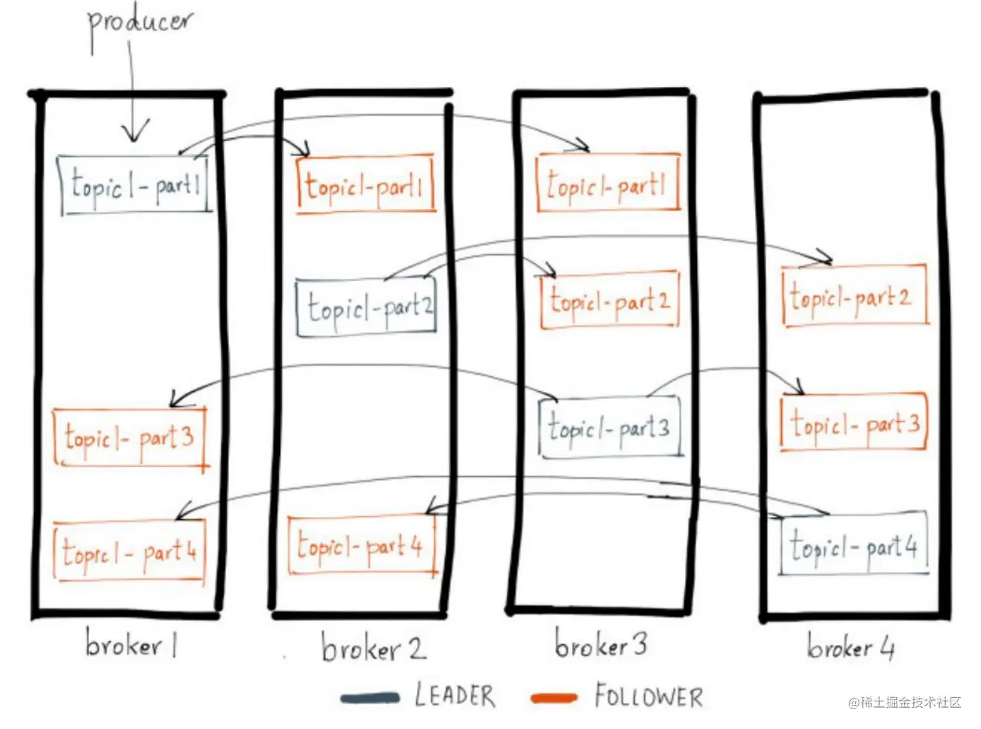 每个Partition有一个leader与多个follower,producer往某个Partition中写入数据是,只会往leader中写入数据,然后数据才会被复制进其他的Replica中。