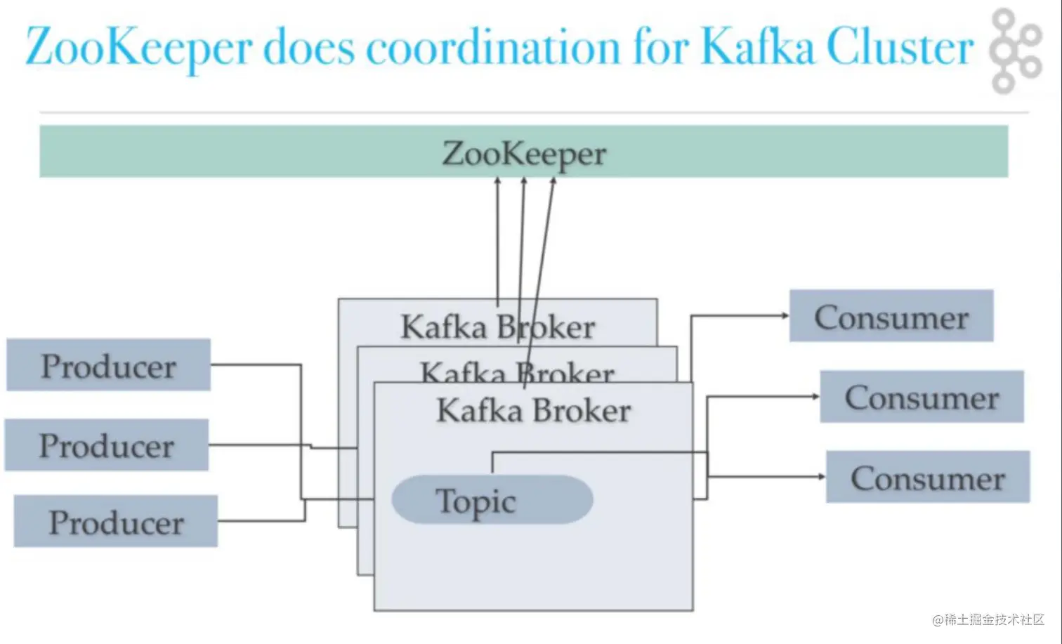 - Topic:每条发布到Kafka集群的消息都有一个类别,这个类别被称为Topic。(物理上不同Topic的消息分开存储,逻辑上一个Topic的消息虽然保存于一个或多个broker上,但用户只需指定消息的Topic即可生产或消费数据而不必关心数据存于何处)。