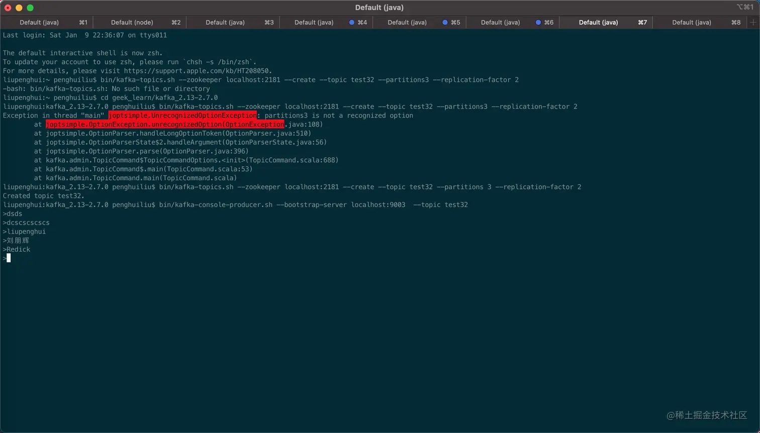 liupenghui:kafka_2.13-2.7.0 penghuiliu$ bin/kafka-console-producer.sh --bootstrap-server localhost:9092 --topic testr