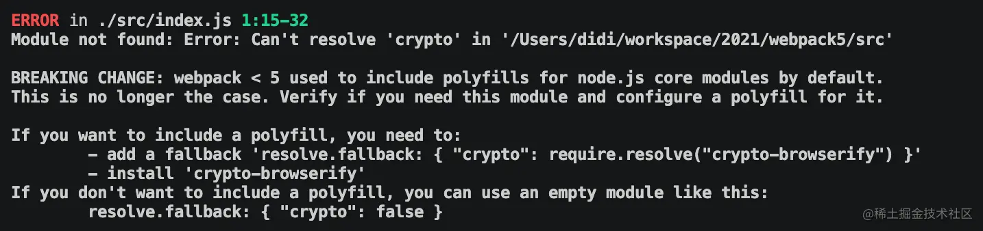总结:因为 webpack 打包默认是输出到浏览器端,如果我们在编写代码的时候引入了 node 的核心模块,此时 webpack5 就会抛出错误,提示我们需要配置 polyfills 。解决办法有三个,第一就是不要去使用 node 模块,而是替换成其他的前端模块。第二就是自己配置 polyfills,第三就不让 node 模块打包进行。