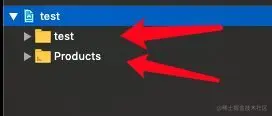 这个节点的类型是PBXGroup, 在它的children属性中, 又引用了另外两个节点. 并且 Xcode 在后面生成了注释/* test /和/ Products */, 其实就是这个mainGroup下级的两个子group. 对应我们 xcode 左边文件结构: