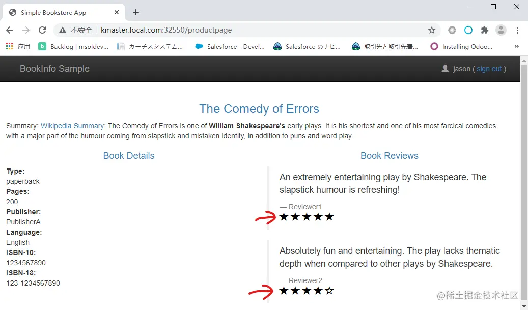 reviews. 这个微服务中包含了书籍相关的评论。它还会调用 ratings 微服务。