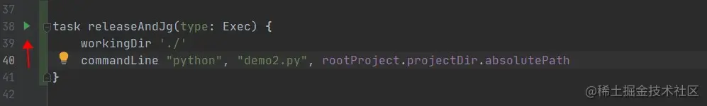 grale中添加:task releaseAndJg(type: Exec) { workingDir './' commandLine "python", "demo2.py", rootProject.projectDir.absolutePath }添加一个