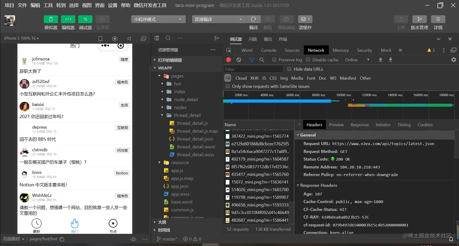 于是便想,那是不是可以打包成h5,在浏览器里调试,这样不就和平时的前端开发一样了么!于是便转向了另一个方向。但是在浏览器端,会有跨域问题,localhost向https://www.v2ex.com/api/发起请求是违反了浏览器的同源策略。小程序开发工具并没有同源策略的限制,于是不会有这个问题。