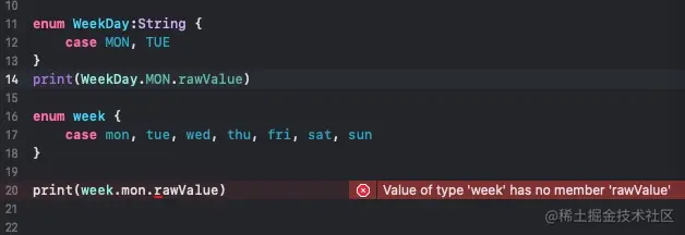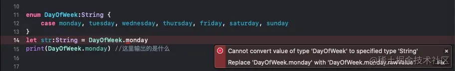 通过运行得知,这里输出为monday。这里需要注意的一点就是枚举值和RawValue是两个不同的东西,比如我们没有办法把一个枚举值分配一个String的变量,即使这个enum是String类型。