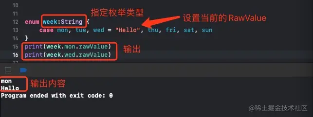 =右边的值在swift中称为 RawValue(原始值),例如 "MON"
