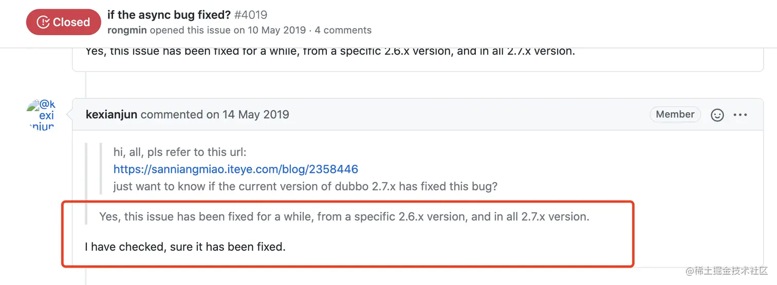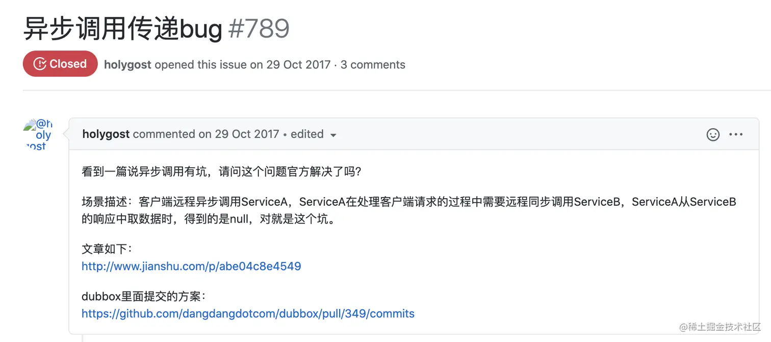 Dubbo异步调用设计初衷是很好的,但是实际微服务场景下,使用async配置异步调用远程服务可能出现问题,原因是异步标识会进行传递,以下链接是一个官方issue: