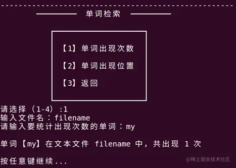 三、检索给定单词,输入一个单词,检索并输出该单词所在的行号、该行中出现的次数以及在该行中的相应位置。