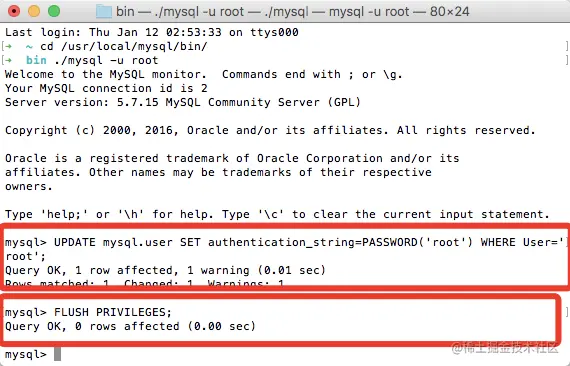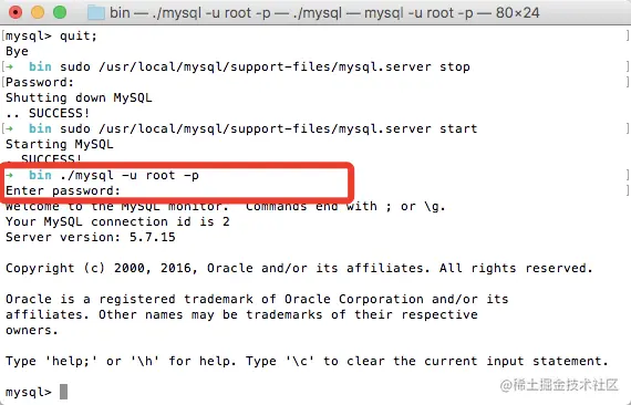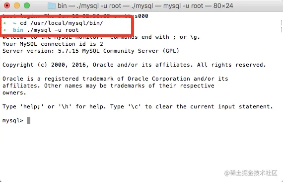 进入 /usr/local/mysql/bin/,以root身份启动 mysql