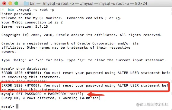 此时,如果出现 ERROR 1820 (HY000): You must reset your password using ALTER USER statement before executing this statement 的错误提示时,需要再设置一次密码