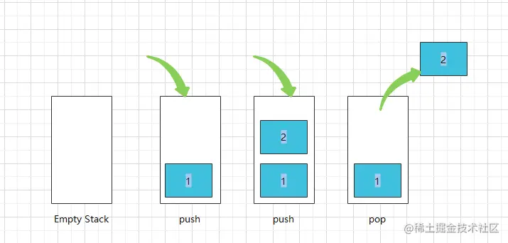 栈遵循后进先出(LIFO)原则进行存储数据,先进入的数据被压入栈底,最后进入的数据在栈顶,需要读取数据的时候从栈顶开始弹出数据。如下图所示: