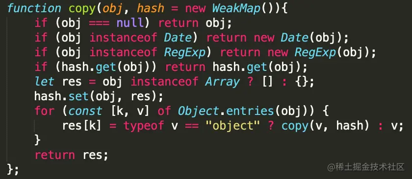 weakMap维护一个变量,变量中储存已经遍历过的对象2、每次递归时判断当前的参数是否已经存在于变量hash中,如果已经存在,就说明已经递归过该变量,就可以停止这次递归并返回上次递归该变量时的返回值