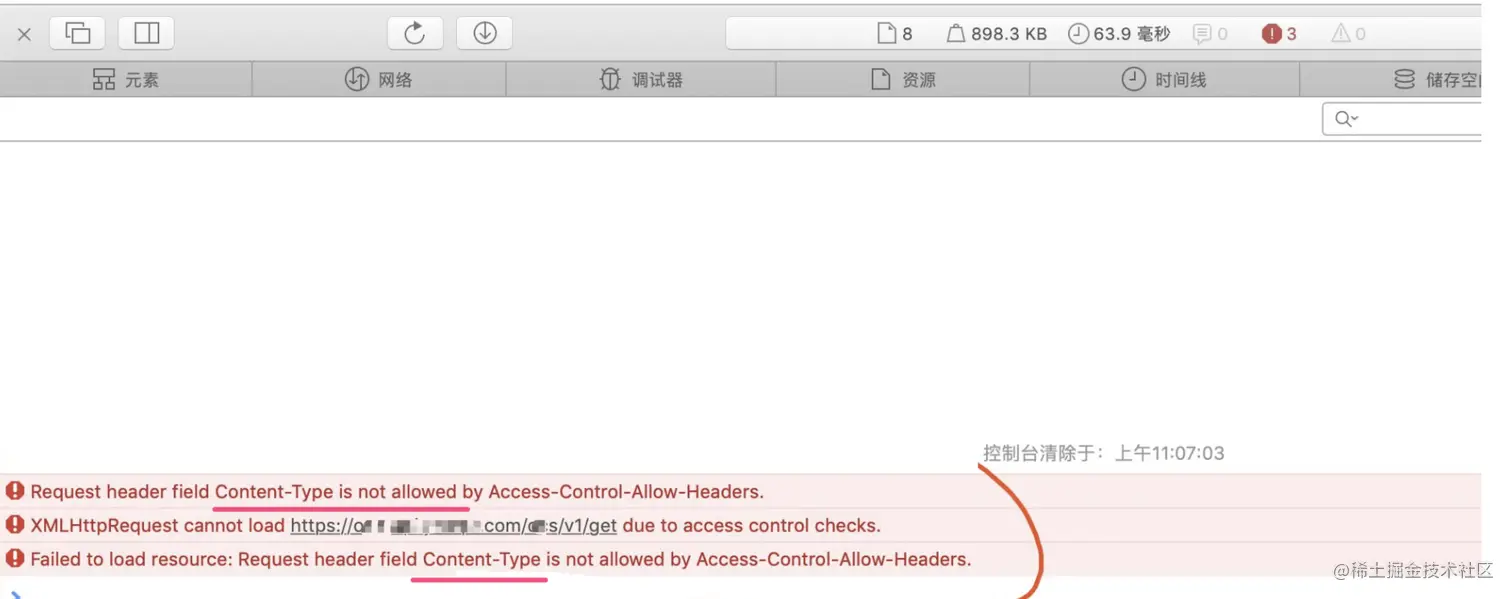 在发送options请求预检的过程中配拦截了,提示请求头字段Content-Type不被允许,关键是chrome中是正常的,看起来是在处理这个特殊场景时Safari和chrome的逻辑不一样导致的。