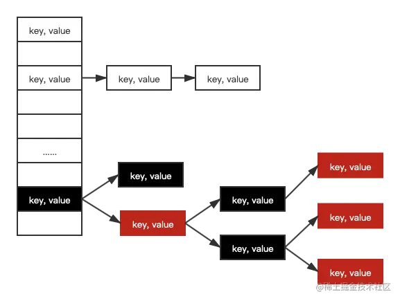 当散列表长度至少为64且链表节点数超过8才会将链表转化成红黑树;当红黑数节点小于6时,红黑树会被转化成链表。所以HashMap的基本结构如下所示: