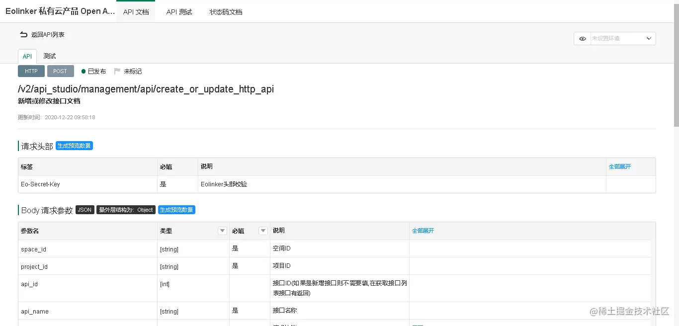 以Eolinker为例,Eolinker为用户提供了该工具的OpenAPI,方便用户集成到开发系统。在每个API开发完成后,快速调用OpenAPI并自动生成API文档。