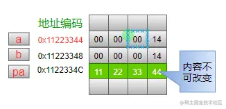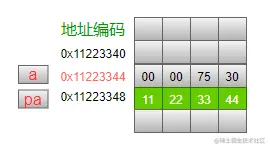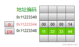 其次,这个内存空间中存储的内容是变量a的地址,而a的地址为0x11223344,所以指针变量pa的地址空间中,就存储了0x11223344这个值。