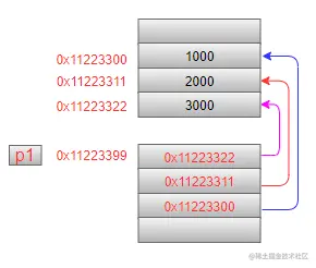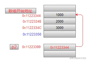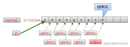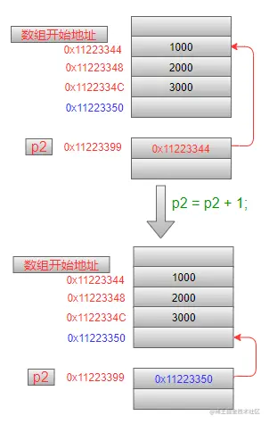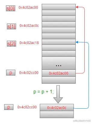 在执行p++操作后,p需要跨过的空间是一个结构体变量在内存中占据的大小(12个字节),所以此时p就指向了数组中第2个元素的首地址,内存模型如下: