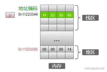 另外,0x11223344,0x11223345,0x11223346,0x11223347这连续的、从低地址到高地址的4个字节用来存储变量a的数值20。在图示中,使用十六进制来表示,十进制数值20转成16进制就是:0x00000014,所以从开始地址依次存放0x00、0x00、0x00、0x14这4个字节(存储顺序涉及到大小端的问题,不影响文本理解)。