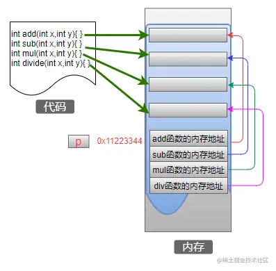 代码中的add函数正好满足这个要求,因此,可以把add赋值给函数指针p,此时p就指向了内存中这个函数存储的地址,后面就可以用函数指针p来调用这个函数了。