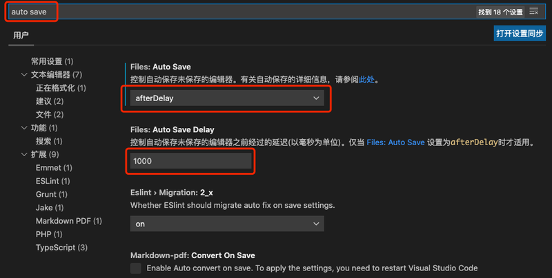 然后搜索 auto save, 如下设置 Auto Save → afterDelay / Auto Save Delay → 1000 , 具体如下图所示.