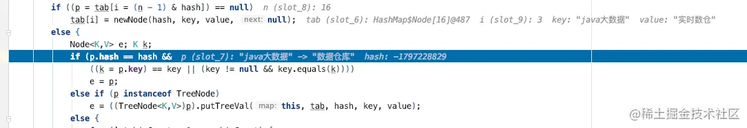 可以看出在进入putval() 方法之间,需要借助hash 方法先计算出key 的hash 值,然后将key 的hash值和key同时传入