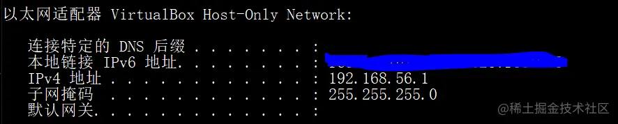 - 在window cmd命令行下,输入ipconfig,显示Virtual Box虚拟网卡ip