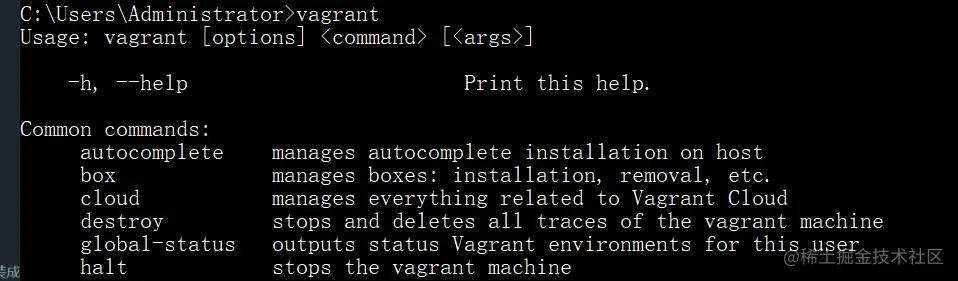 安装后cmd打开命令窗口输入vagrant,若有vagrant提示信息则安装成功