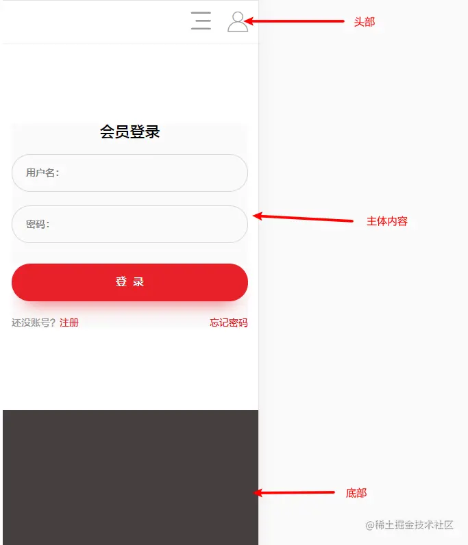 首先一个页面可以分为三个区域,头部区,主体内容区,底部区。 头部区域一直浮动在顶部,和底部区域一样高度不会变化。所以我们只需要获取到屏幕高度然后减去头底部高度就是内容区域的最小高度。