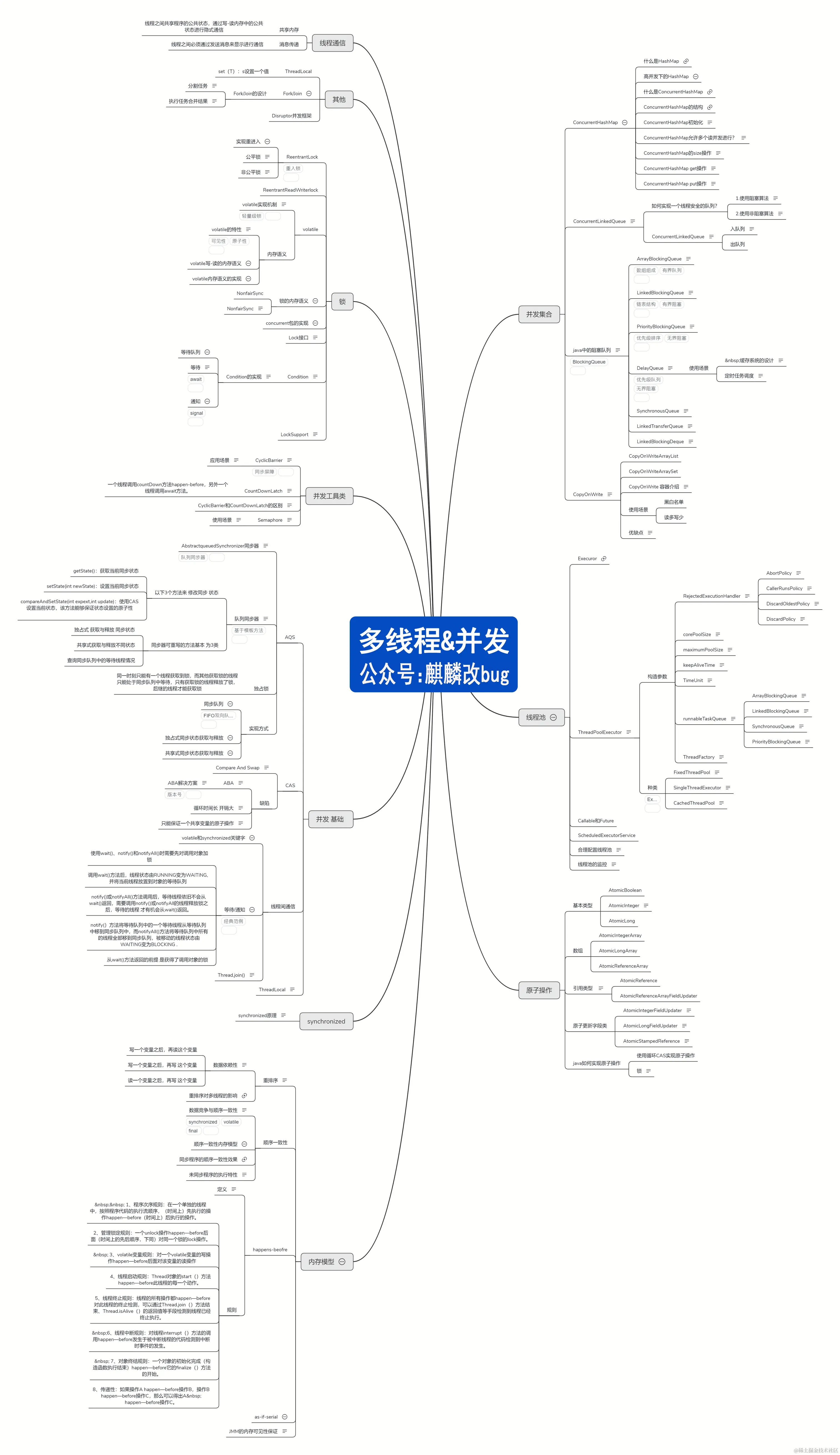 Java 多线程一直是面试时候的重点,也是能力提升的重要体现,如何做到波澜不惊,从容面对,需要我们对其中的内容融汇贯通,小编这里也对应总结了一份多线程-并发编程的思维导图,需要的朋友可以看看,关注公众号:麒麟改bug,还可以领取一份包含了Java基础、Java集合容器、Java异常、并发编程、JVM、Spring、Spring MVC、Spring Boot、Spring Cloud、MyBatis、Redis、MySQL数据库、消息中间件MQ与RabbitMQ、Dubbo、Linux、Tomcat、ZooKeeper、Netty、 架构设计&分布式&数据结构与算法等等,都是互联网大厂的面试真题,已经有粉丝靠这份PDF拿下众多大厂的offer。