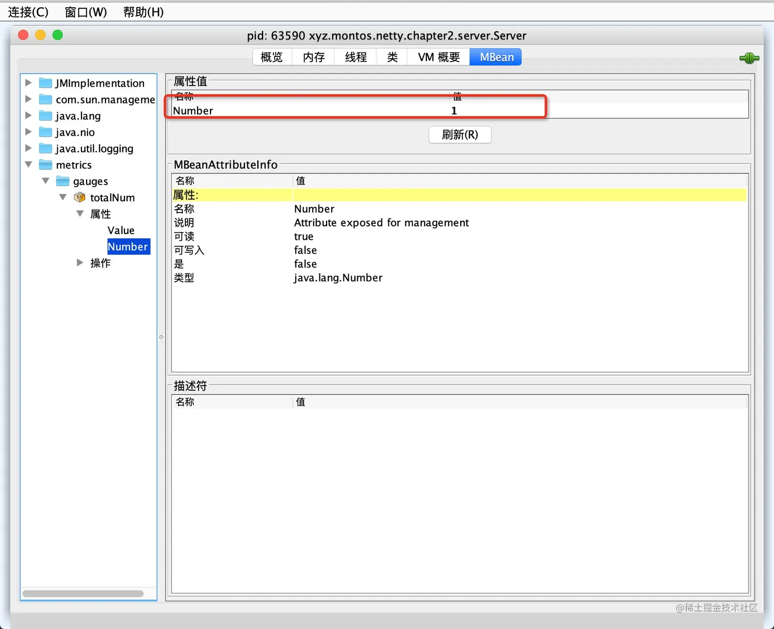 上面的MetricHandler主要是用来进行连接数的展示,里面有个变量记录连接数的变化。同是这里实现了两种Metric展示,一种是控制台5秒自动刷新,还有一种是通过MBean进行查看。