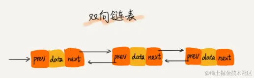 单向链表只有一个方向,结点只有一个后继指针 next 指向后面的结点。而双向链表,顾名思义,它支持两个方向,每个结点不止有一个后继指针 next 指向后面的结点,还有一个前驱指针 prev 指向前面的结点。