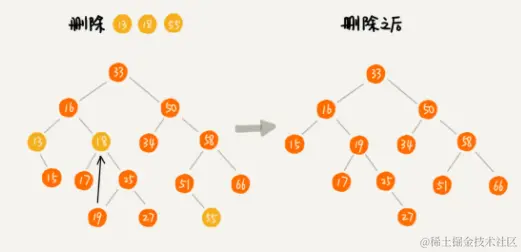 对于第一种情况,不管是单链表还是双向链表,为了查找到值等于给定值的结点,都需要从头结点开始一个一个依次遍历对比,直到找到值等于给定值的结点,然后再通过我前面讲的指针操作将其删除。尽管单纯的删除操作时间复杂度是 O(1),但遍历查找的时间是主要的耗时点,对应的时间复杂度为 O(n)。根据时间复杂度分析中的加法法则,删除值等于给定值的结点对应的链表操作的总时间复杂度为 O(n)。对于第二种情况,我们已经找到了要删除的结点,但是删除某个结点 q 需要知道其前驱结点,而单链表并不支持直接获取前驱结点,所以,为了找到前驱结点,我们还是要从头结点开始遍历链表,直到 p->next=q,说明 p 是 q 的前驱结点。但是对于双向链表来说,这种情况就比较有优势了。因为双向链表中的结点已经保存了前驱结点的指针,不需要像单链表那样遍历。所以,针对第二种情况,单链表删除操作需要 O(n) 的时间复杂度,而双向链表只需要在 O(1) 的时间复杂度内就搞定了!