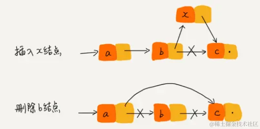 与数组一样,链表也支持数据的查找、插入和删除操作。我们知道,在进行数组的插入、删除操作时,为了保持内存数据的连续性,需要做大量的数据搬移,所以时间复杂度是 O(n)。而在链表中插入或者删除一个数据,我们并不需要为了保持内存的连续性而搬移结点,因为链表的存储空间本身就不是连续的。所以,在链表中插入和删除一个数据是非常快速的。为了方便你理解,我画了一张图,从图中我们可以看出,针对链表的插入和删除操作,我们只需要考虑相邻结点的指针改变,所以对应的时间复杂度是 O(1)。